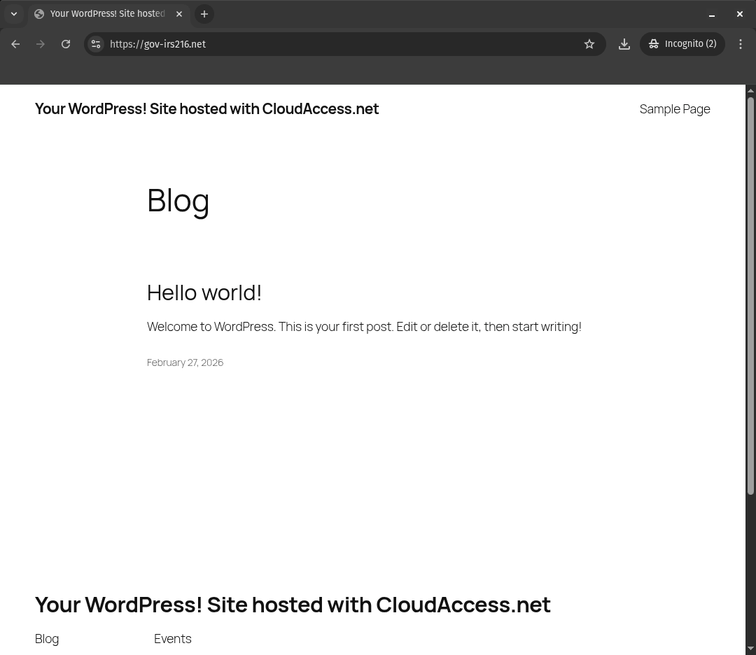 Poking around, the site itself is hosted by CloudAccess.net, a legitimate, managed Joomla/Wordpress hosting provider. The site itself is running WordPress, and the administrator account is a seemingly keyboard-smashed username: odldrkgr. The site doesn’t appear to be compromised (e.g. it looks like the attacker created the account themselves, and the only post is “Hello world!” which is created when installing Wordpress) and has been online since February 27th, shortly before I received the email from Eventbrite.